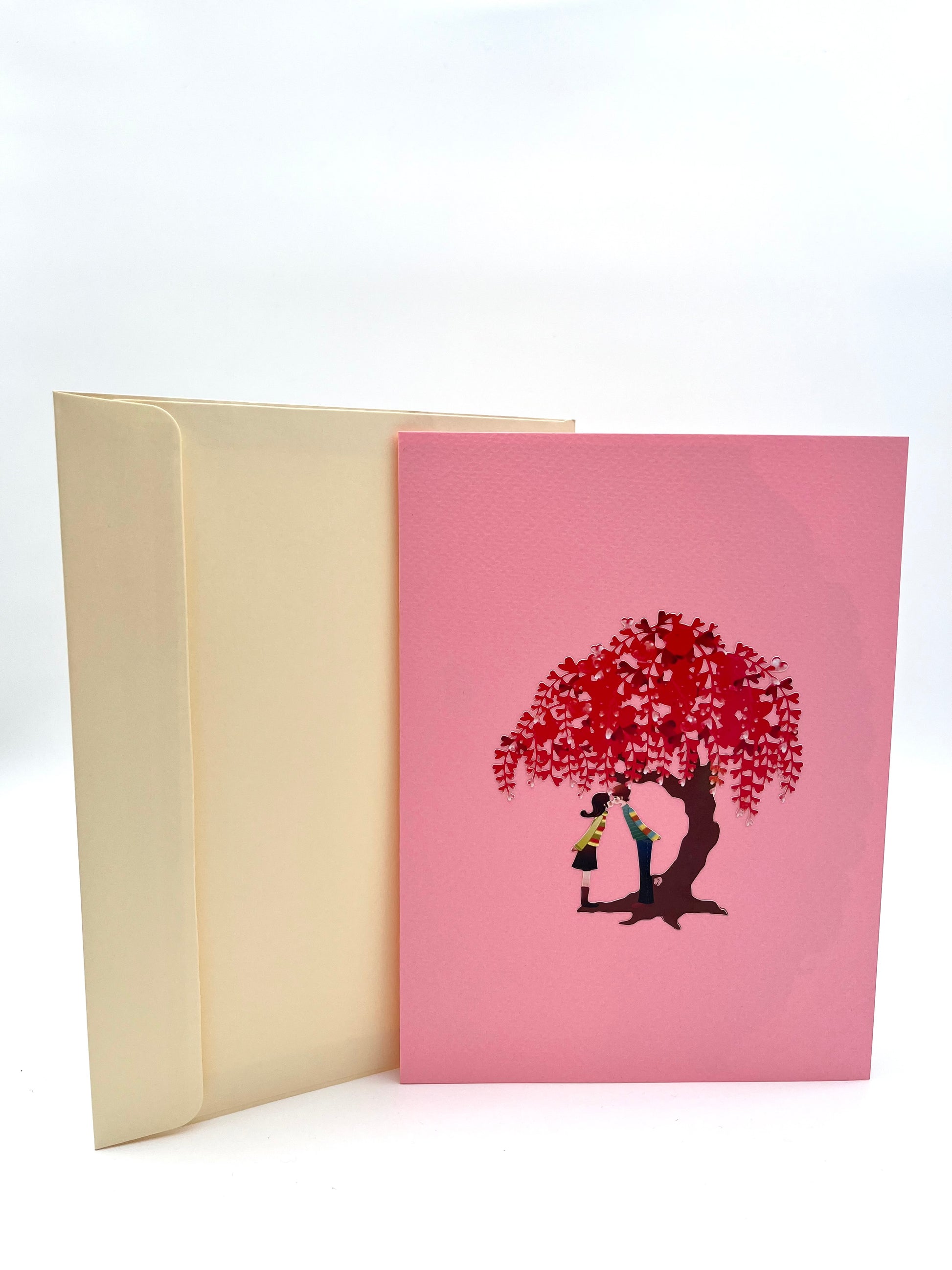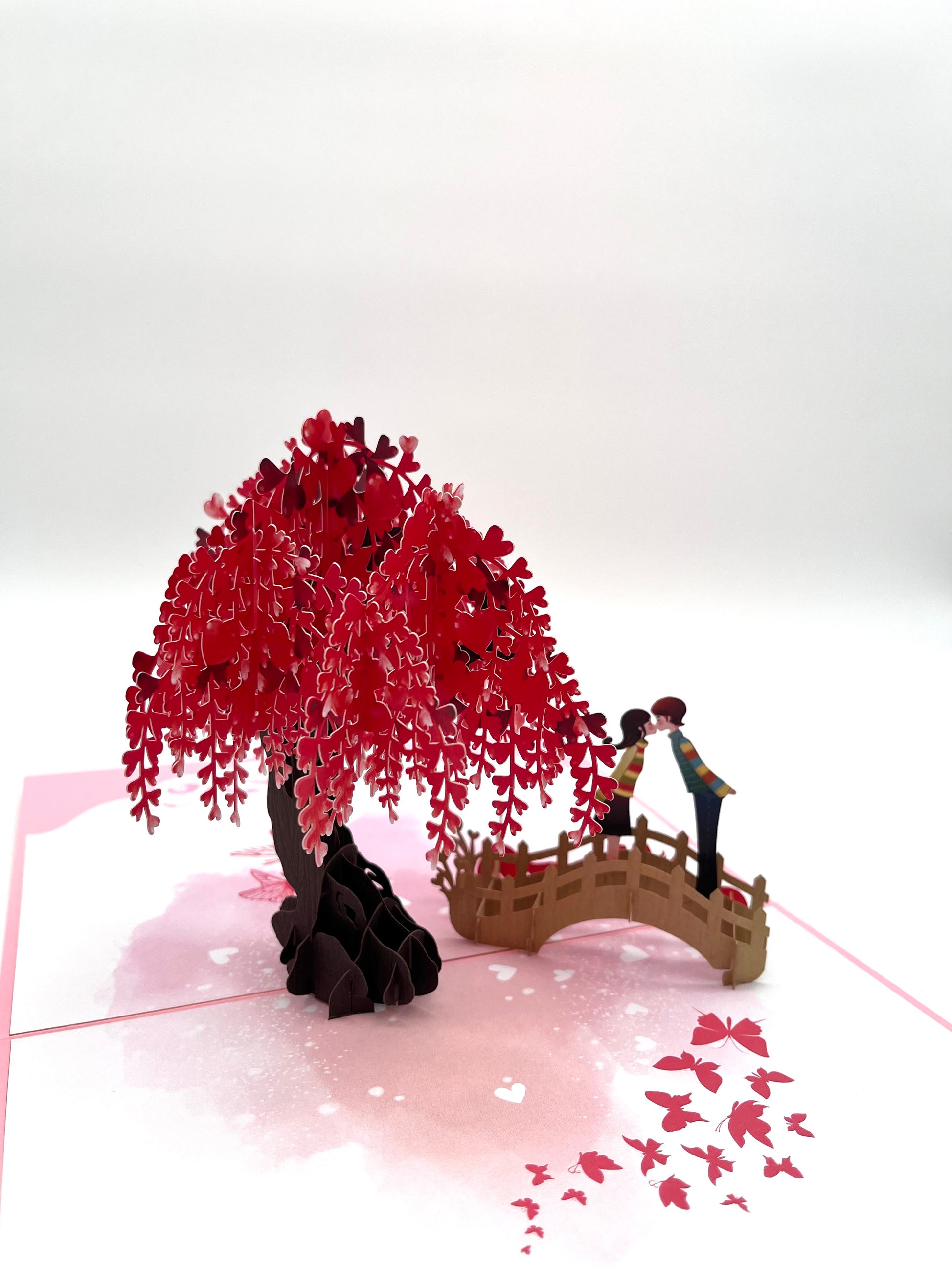Ein wahrer Blickfang für besondere Momente der Liebe! Beim Öffnen dieser zauberhaften Karte entfaltet sich ein romantisches 3D-Motiv: Ein sich küssendes Paar, das unter einem prachtvollen Kirschblütenbaum auf einer Brücke steht. Umgeben von roten Schmetterlingen und einer elegant weißen Verzierung im Inneren, vermittelt die Karte pure Zweisamkeit und Romantik.