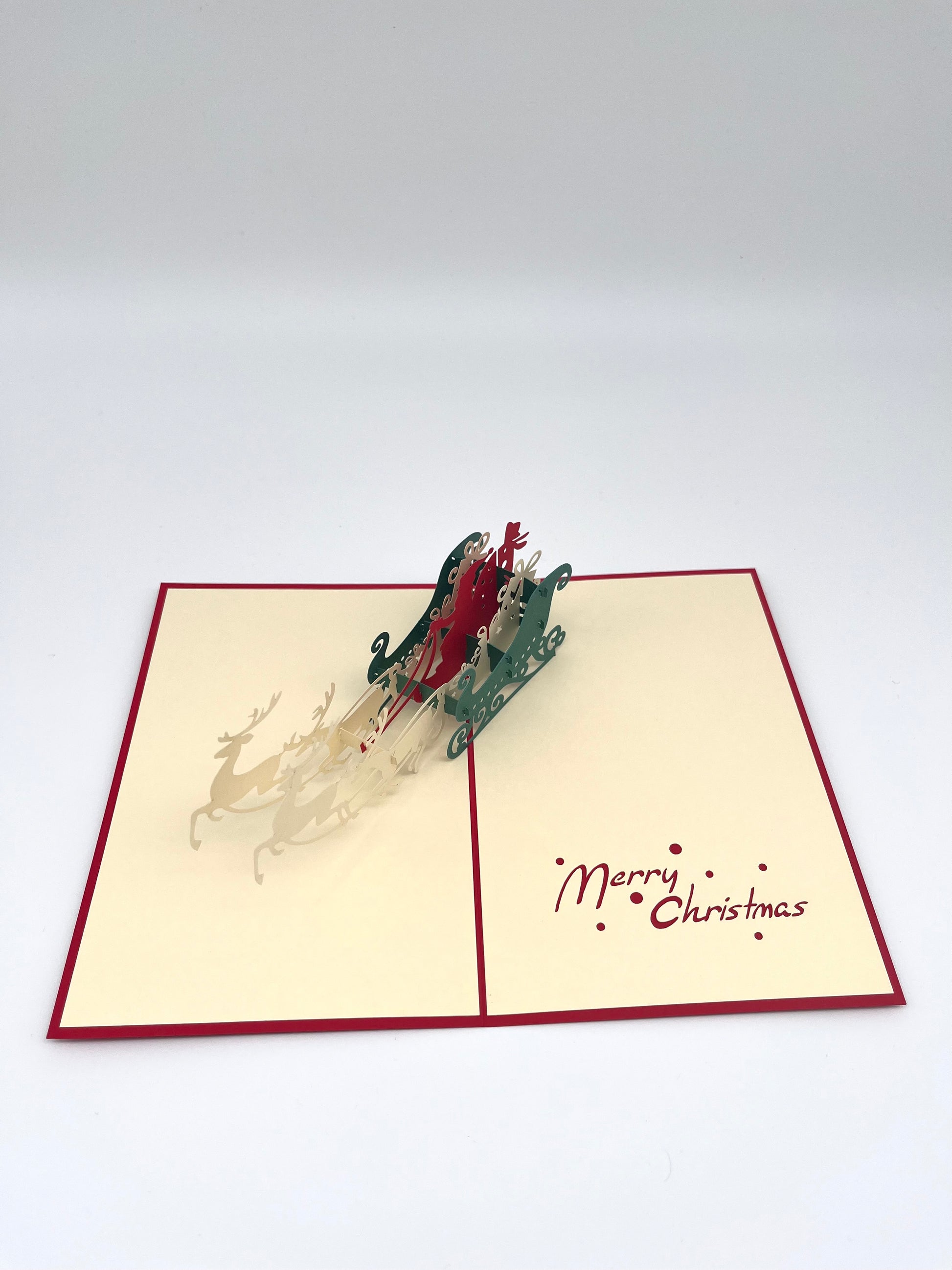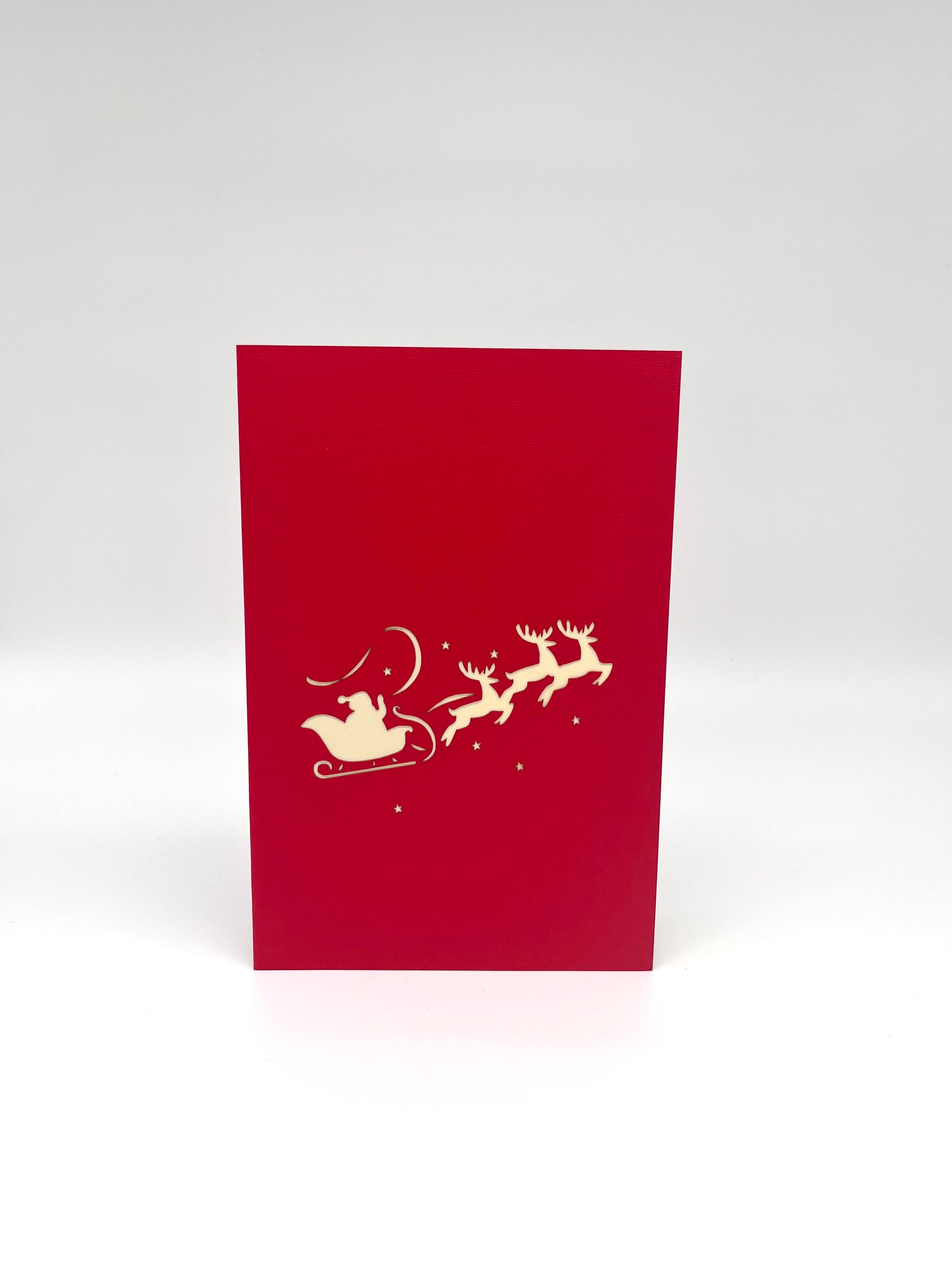 Tauche ein in die zauberhafte Weihnachtswelt! Beim Öffnen dieser besonderen Karte entfaltet sich eine beeindruckende 3D-Szene: Der Weihnachtsmann fliegt mit seinem Schlitten voller Geschenke, gezogen von seinen treuen Rentieren, durch die winterliche Nacht. Ein fröhliches „Merry Christmas“ ziert das Innere der Karte und unterstreicht die festliche Botschaft.