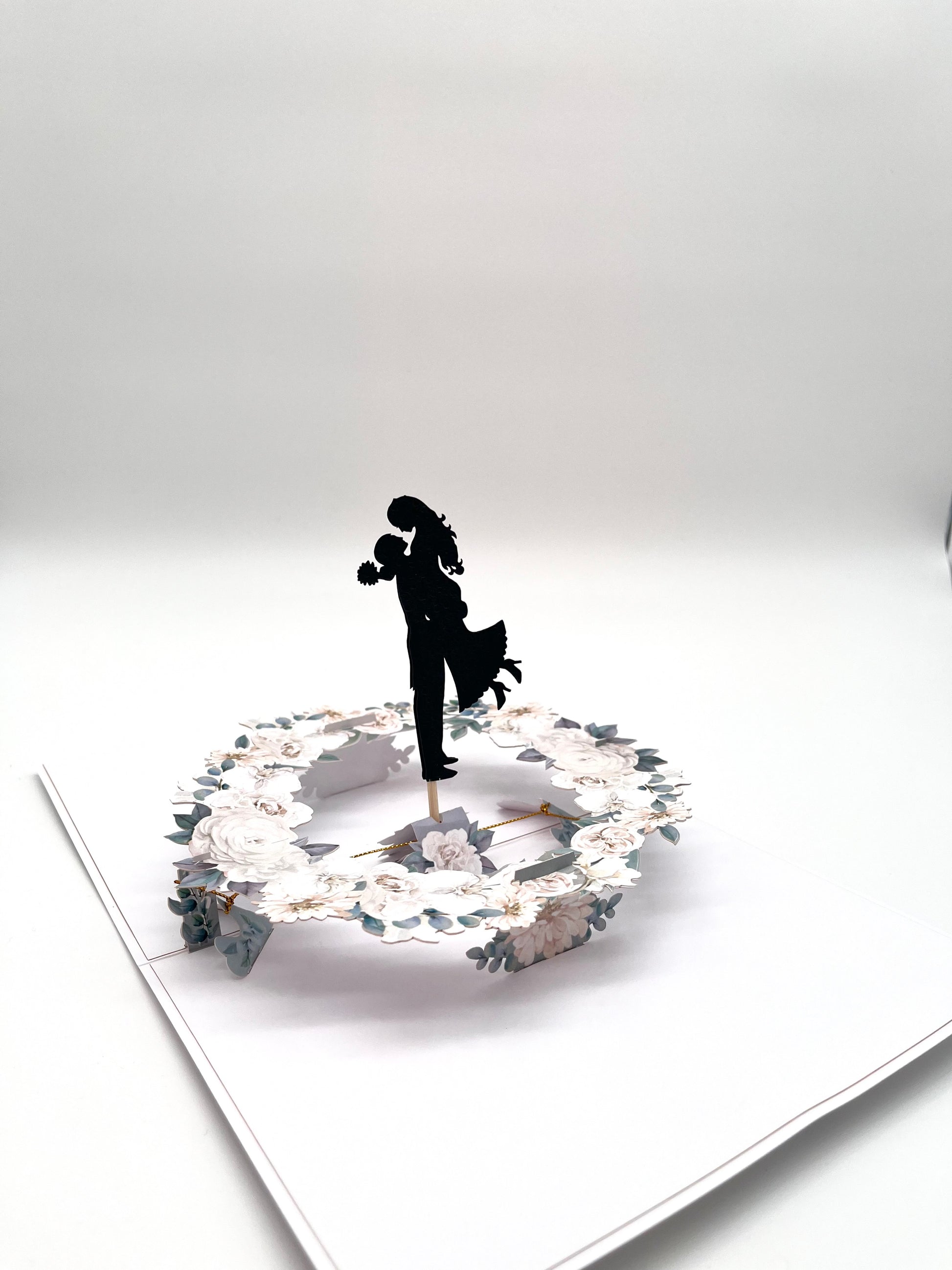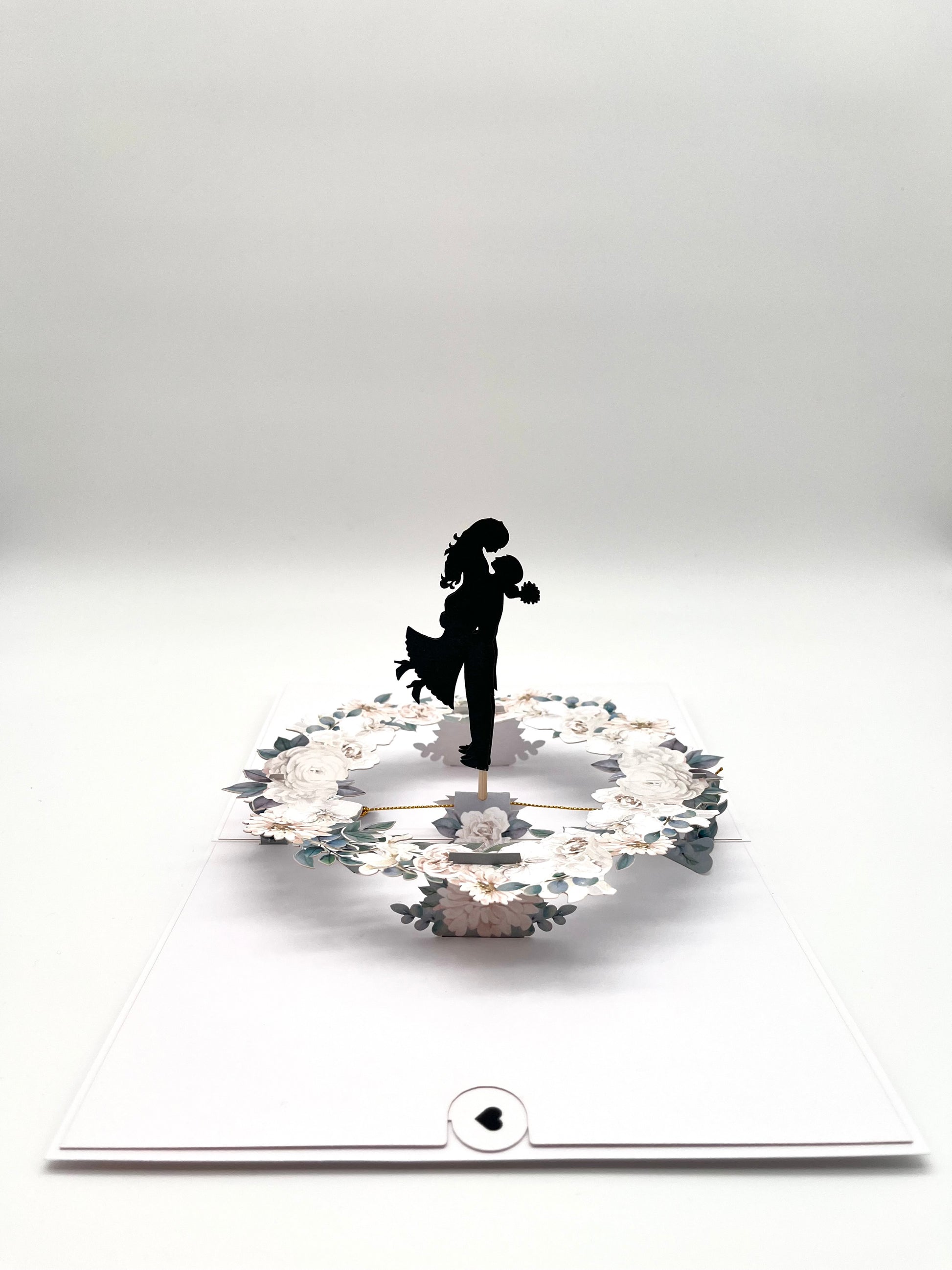 Romantik pur! Beim Öffnen dieser eleganten Karte entfaltet sich ein zauberhaftes 3D-Motiv: Ein verliebtes Paar tanzt harmonisch inmitten von weißen Blumen und dreht sich um 360 Grad, als Ausdruck für die Magie der Liebe und Harmonie. Diese detailreiche Darstellung wird garantiert zum Highlight jeder Feier.
