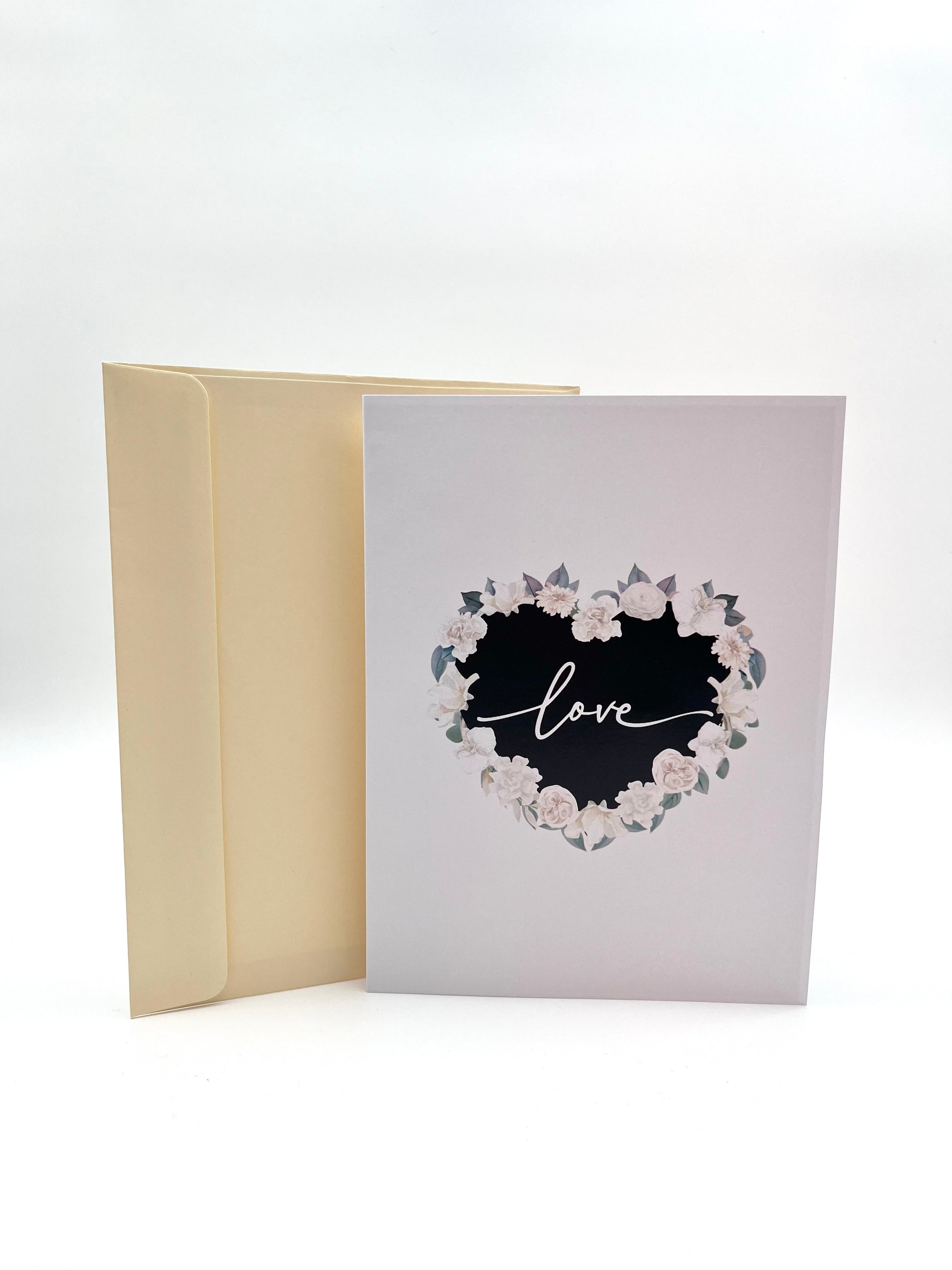 Das edle Cover der Karte zeigt ein schwarzes Herz, geschmückt mit zarten weißen Blumen und der Aufschrift „Love“. Es symbolisiert die tiefen Gefühle, die diese Karte perfekt transportiert.